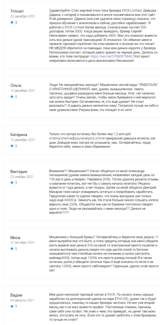 Многие отзывы указывают на использование фейковых профилей в Instagram и Telegram, которые после обмана удаляют аккаунты. Отдельные участники отмечают, что после отказа от доплат их обвиняют в мошенничестве. Независимые ресурсы подтверждают отсутствие регуляции у FXCR Limited. Сертификат ЦРОФР не имеет юридической силы.