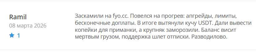 - В отзывах о Fyo cc часто жалуются на проблемы с выводом средств, поэтому деньги могут просто зависнуть на счете.