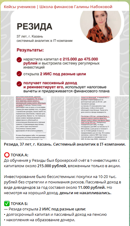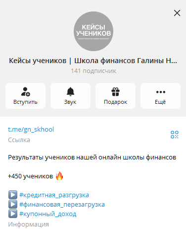 В Телеграме разработчик инвест схемы создал специализированную группу, в ленте которой демонстрируются кейсы и отзывы учеников школы финансов Галины Набоковой.