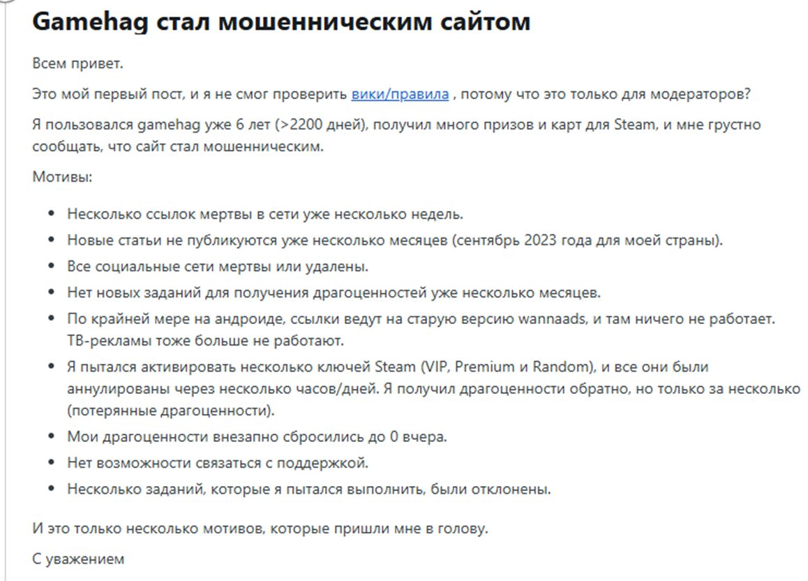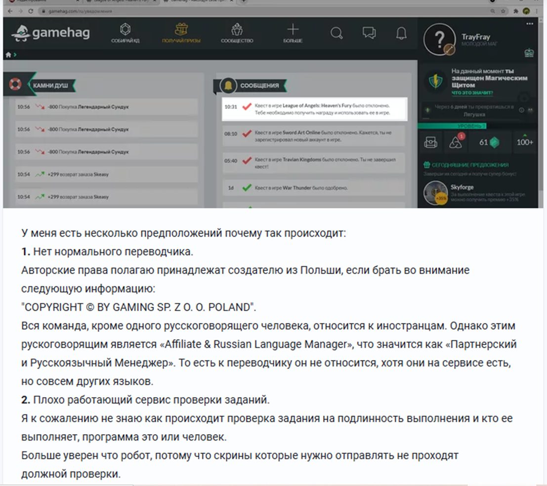 В отзывах на Gamehag игроки рассказывают, что используют проект далеко не первый год. Однако в последнее время начались трудности с выводом прибыли, задержки в работе сайта.