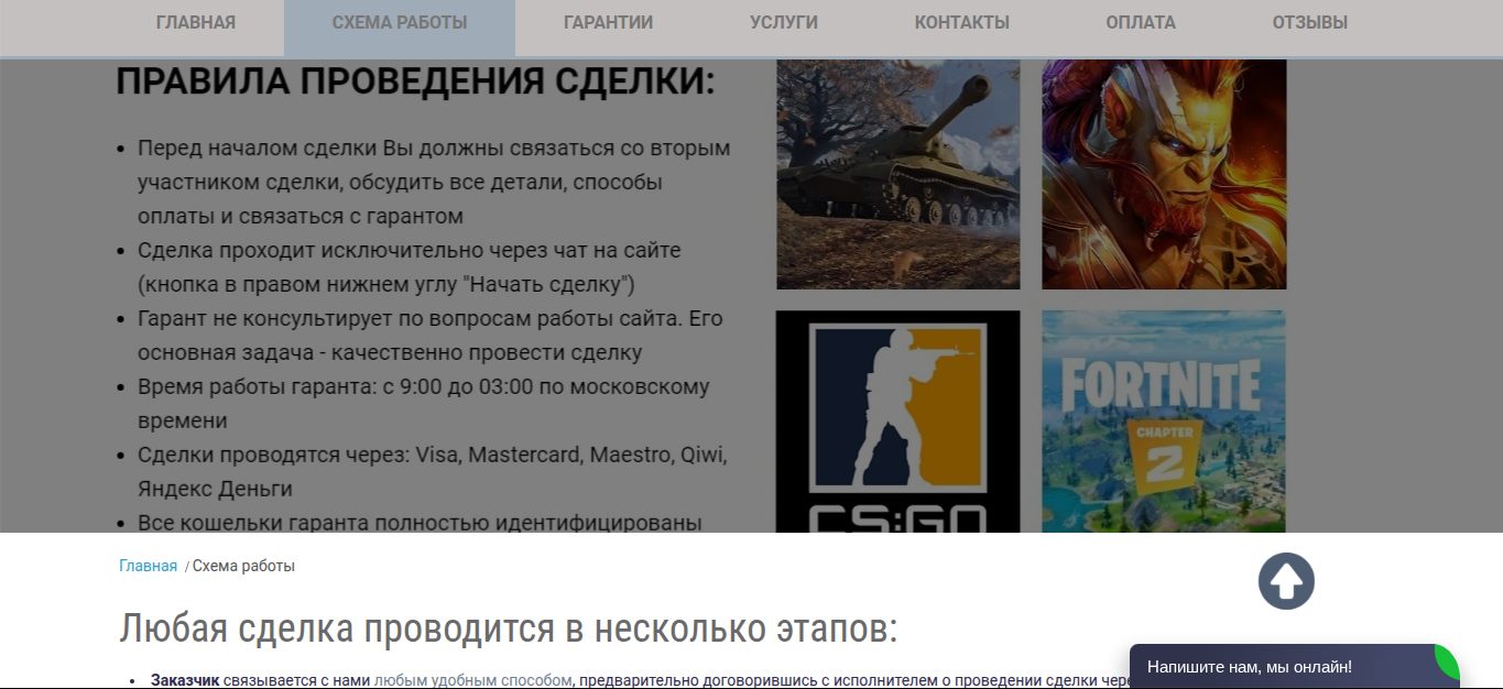 Заказчик связывается с менеджерами Garant Games ru и обсуждает условия работы. Далее клиент заполняет заявку, где указывает сумму сделки, платежную систему и данные для связи. После этого, сервис выставляет счет для оплаты. Если все прошло успешно, то исполнитель получает деньги, а заказчик услуги.