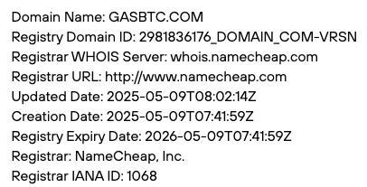 Запросив данные домена gasbtc com из WHOIS, мы выяснили, что регистратор его выдал только 9 мая 2025-го года. Каких-либо других адресов к веб-ресурсу биржи привязано не было.
