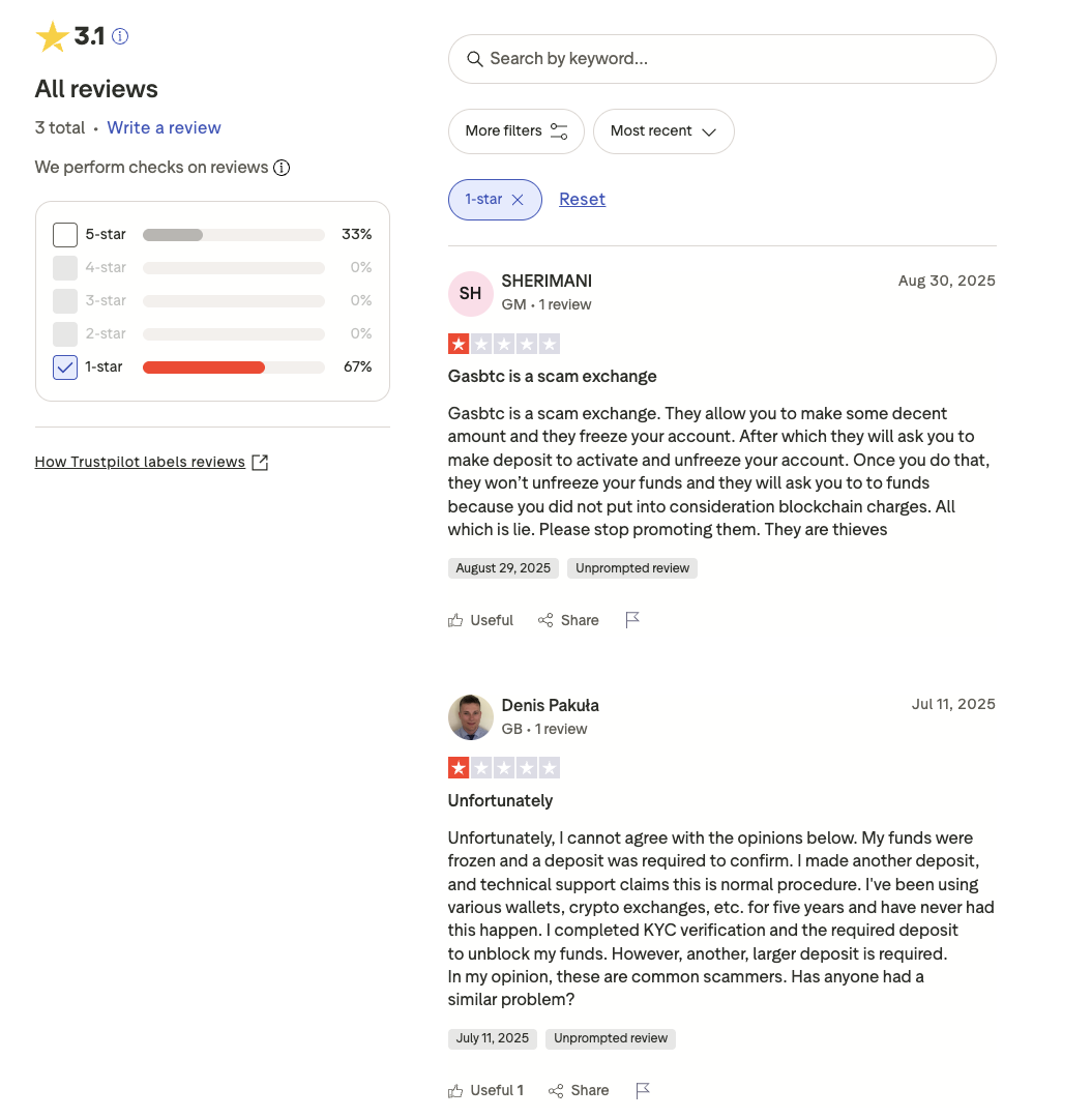 Авторы отрицательных ревью предупреждали, что сайт gasbtc com принадлежит мошенникам. Они утверждали, что владельцы этой площадки заманивают клиентов супер-выгодными условиями обмена и трейдинга, а затем под выдуманными причинами блокируют их аккаунты под надуманными причинами.
