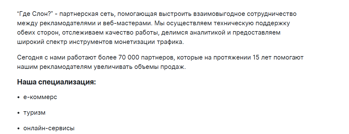 Офферы на «ГдеСлон ру» делятся по тематикам: е-commerce, туризм и онлайн-сервисы. По заявлению самой сети, рекламодателей много, включая крупные магазины.