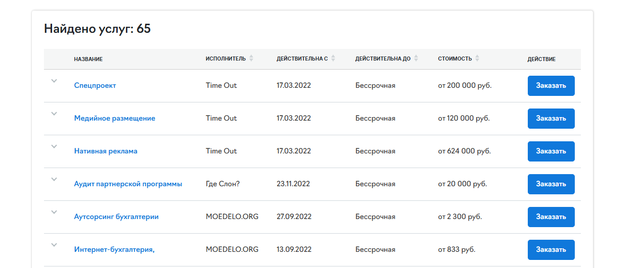 На сайте также есть каталог платных маркетинговых услуг: медийная реклама, аудит, бухгалтерия, SEO, подготовка рекламных кампаний и другие инструменты. По сути, это витрина сторонних подрядчиков с ценами.