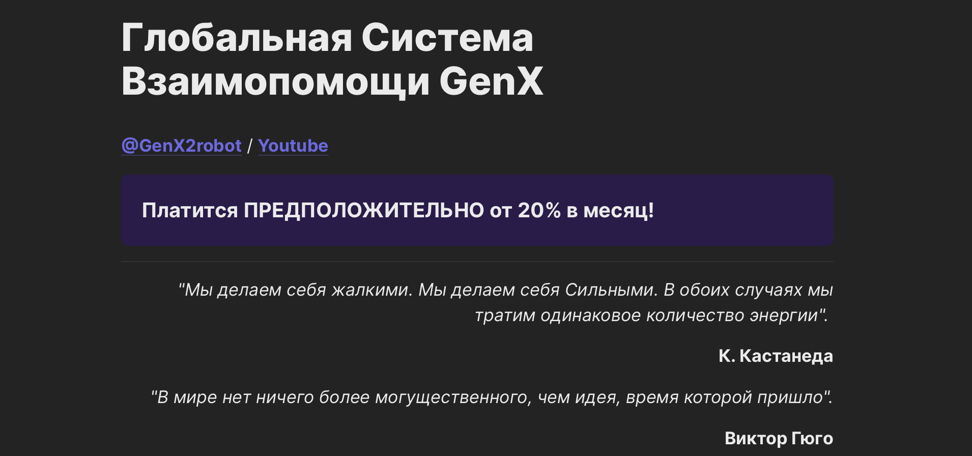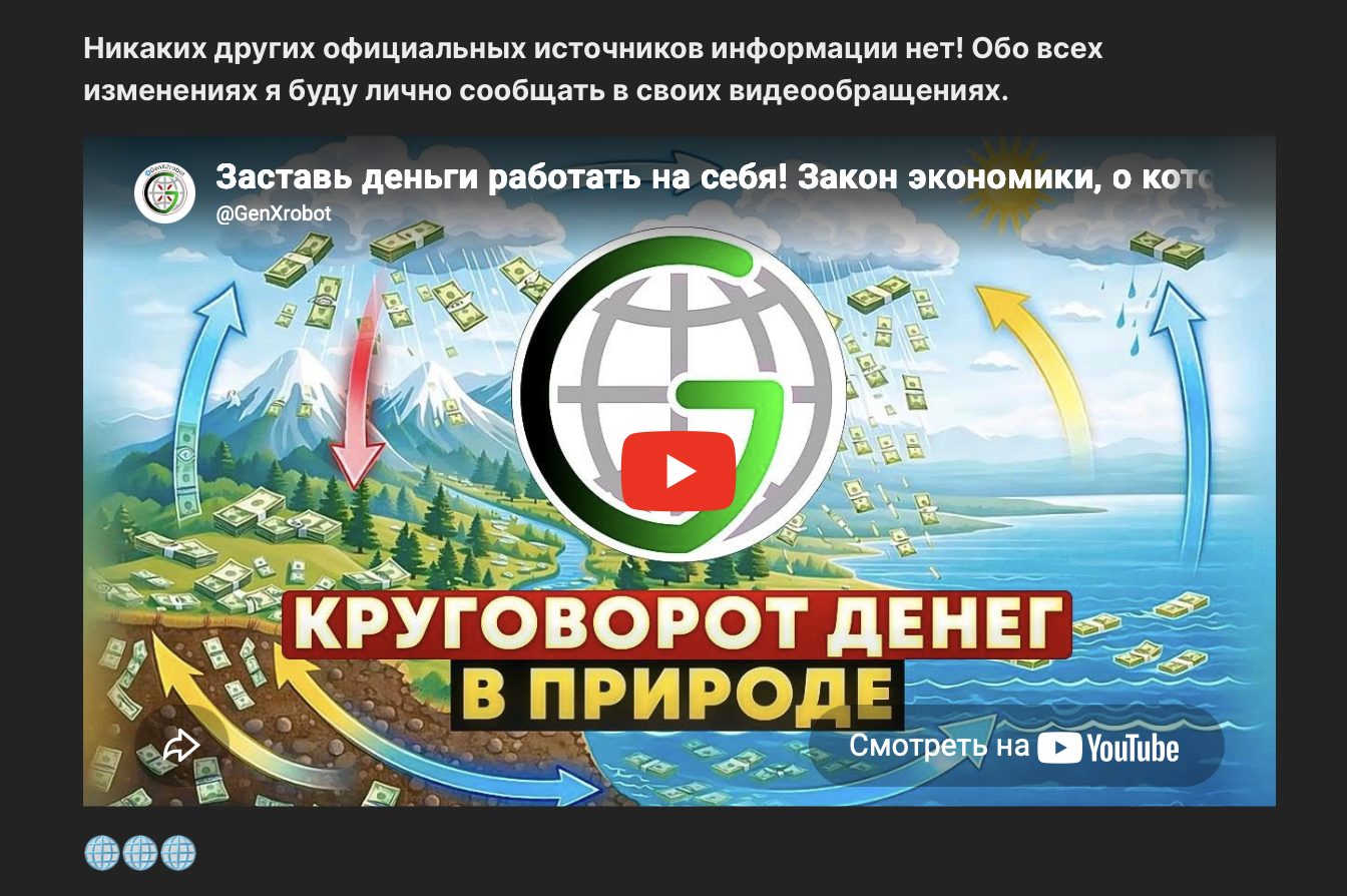 Главный бот проекта — @genXautobot, доступный только в телеграм. Также мы нашли связанные с ним сообщества с отзывами (@GenXpeople), папки с документами на Teletype и видеоматериалы. Также упоминается YouTube, где публикуются презентации и обращения основателя. Проект продвигается через внутренние ссылки и призывы делиться информацией.