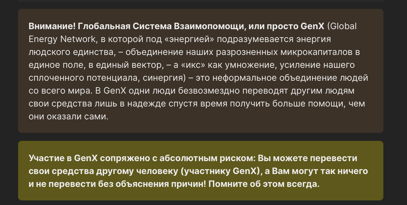 GenX — система, в которой участники якобы безвозмездно переводят средства друг другу. Таким образом они формируют единое «поле энергии» или «вектор помощи». Основная идея сомнительного проекта в том, что сегодня помогаете вы, а завтра сами получаете помощь от других, но с еще большей отдачей.