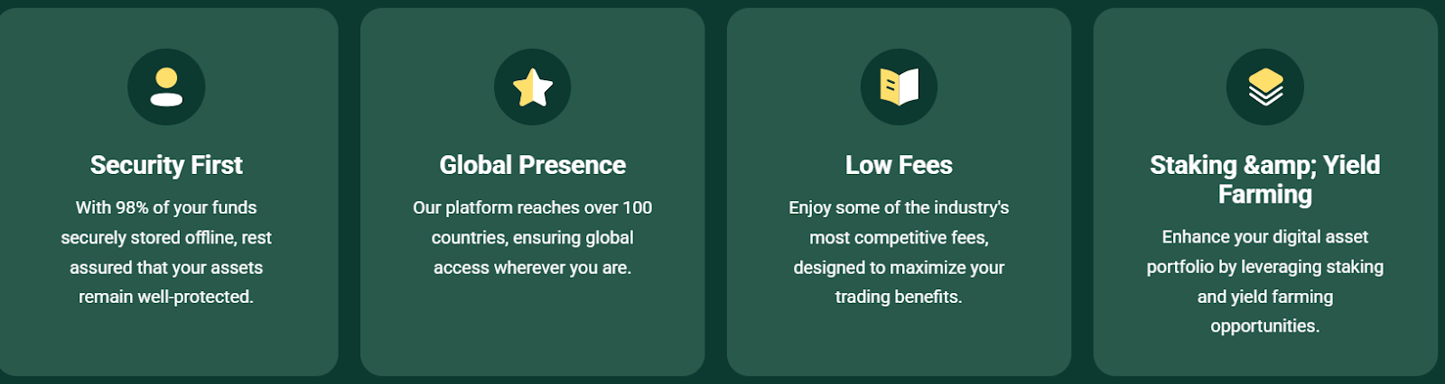 Представители биржи делают акцент на прозрачности и безопасности сотрудничества. Предлагают зарабатывать на площадке методом трейдинга, стейкинга, арбитража и фарма. Трейдерам доступно более 150 криптомонет и более 200 торговых пар. Поддерживается 3 национальные валюты. По данным статистики, на площадке зарегистрировано свыше 120 тысяч трейдеров. В сутки они заключают сделок на сумму около 10000000 долларов.