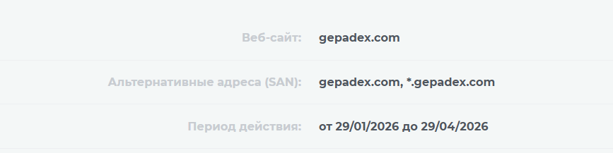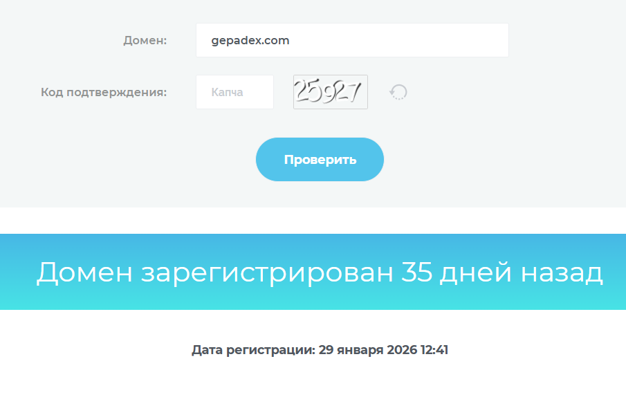 Более того, заявление о работе с 2022 года оказалось ложью. Проверка показала, что сайт gepadex com был создан 29 января 2026 года. Завышение срока деятельности свойственно мошенническим проектам.