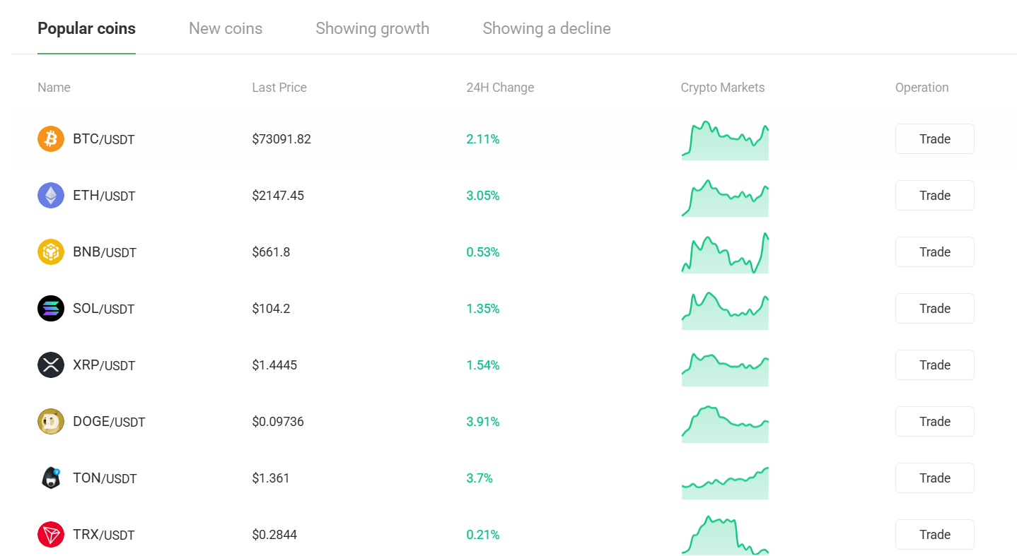 На Gepadex можно торговать Bitcoin, USDT, TON, Solana и другими популярными криптомонетамм. На главной странице приведен график изменения стоимости по каждому направлению.