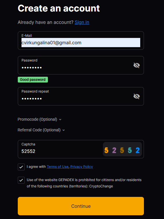 Для начала торговли нужно пройти регистрацию. В форме предлагают указать e-mail и пароль, а также ввести проверочный код.