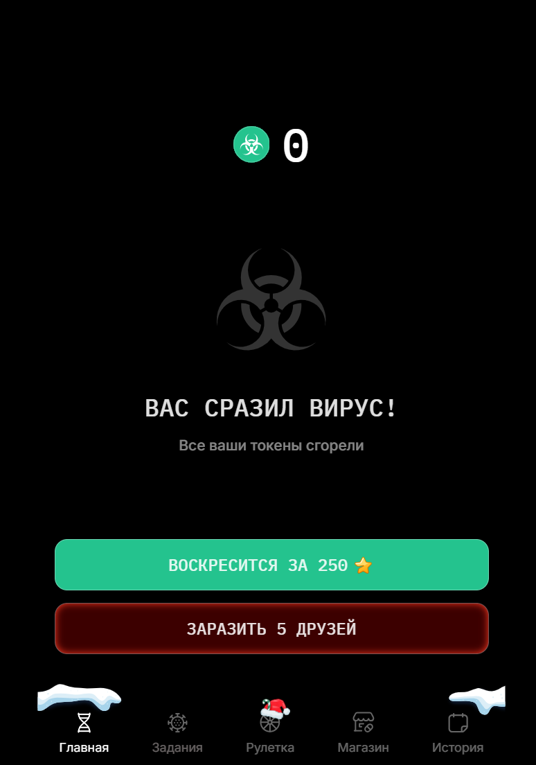 На главном экране стоит заглушка — вирус поразил игрока и не позволяет заходить в задания, магазин, а также зарабатывать токены. Для разблокировки опций нужно пополнить счет на 250 звезд и активировать воскрешение или пригласить 5 рефералов. Когда VIRUS play bot был только запущен, требования были другие — 500 Stars или 3 друга.