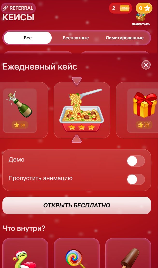 Ежедневный кейс позволяет вытащить подарки стоимостью от 25 звезд, в случае неудачи будет награда 2 Stars.