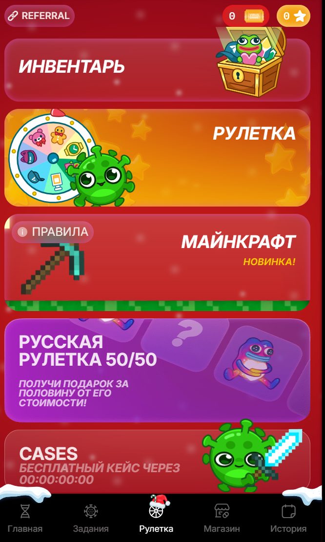 Gift Relayer VIRUS в ТГ — приложение, где можно испытать удачу и попробовать заработать подарки, токены и звезды. Для вывода потребуется активировать аккаунт, заплатив 250 звезд или приведя 5 рефералов.