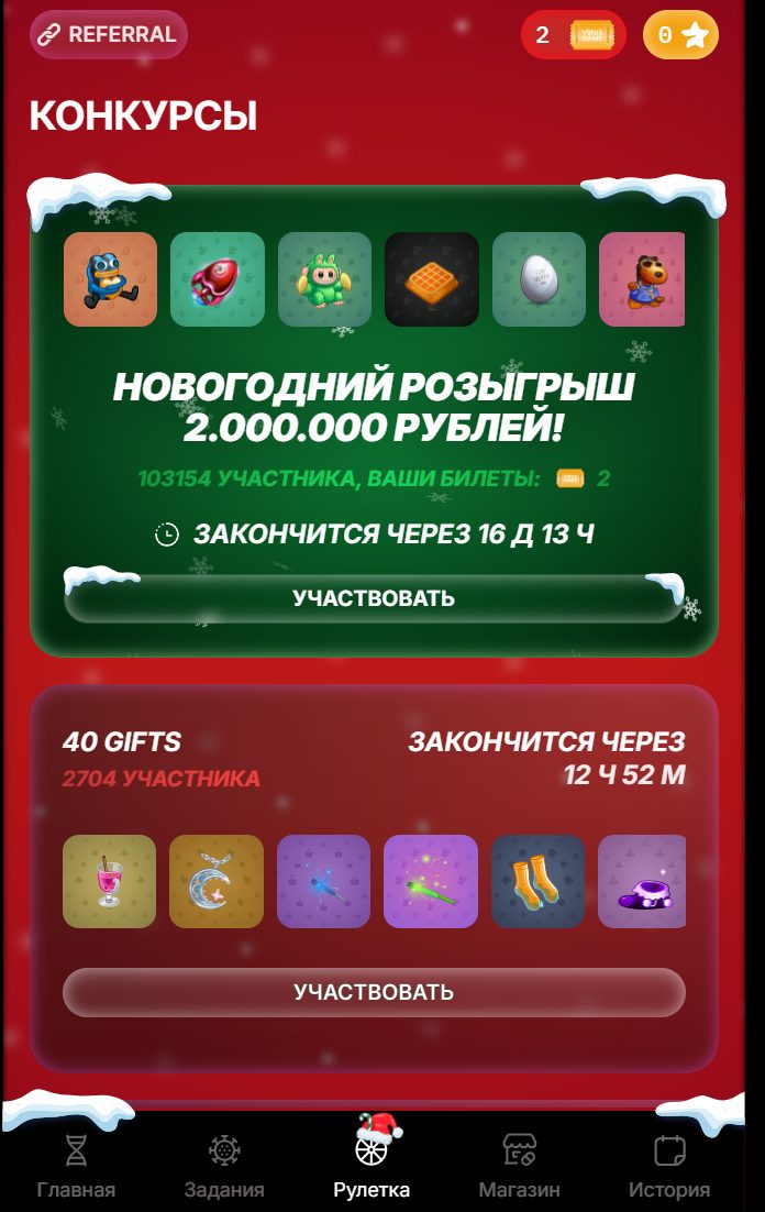 За разные активности пользователи собирают билеты, бесплатно их дают каждые 12 часов. Чем больше будет накоплено, тем выше шансы получить в новогоднем розыгрыше что-то стоящее. Определение победителя будет в середине февраля, сейчас около 100 тысяч участников уже зарегистрированы в ивенте. В этом же разделе есть мини раздачи длительностью набора желающих 7 дней. Пользователи должны подписаться на каналы партнеров проекта и нажать кнопку Участвую. Количество призов лимитировано.