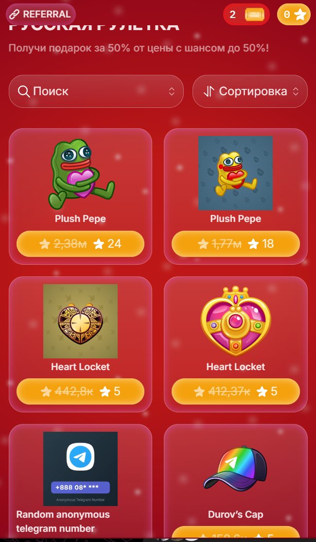 Русская рулетка предлагает 50% шанс на получение 50% скидки на подарки, здесь же есть анонимные номера в Телеграмм.