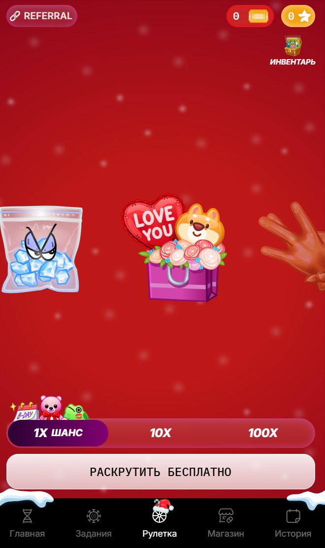 Раздел Рулетка открывает массу возможностей для заработка. Непосредственно рулетка дает бесплатный спин, можно испытать удачу и вытащить подарок, шанс ниже 1%. В качестве утешительного приза дают 2 звезды.