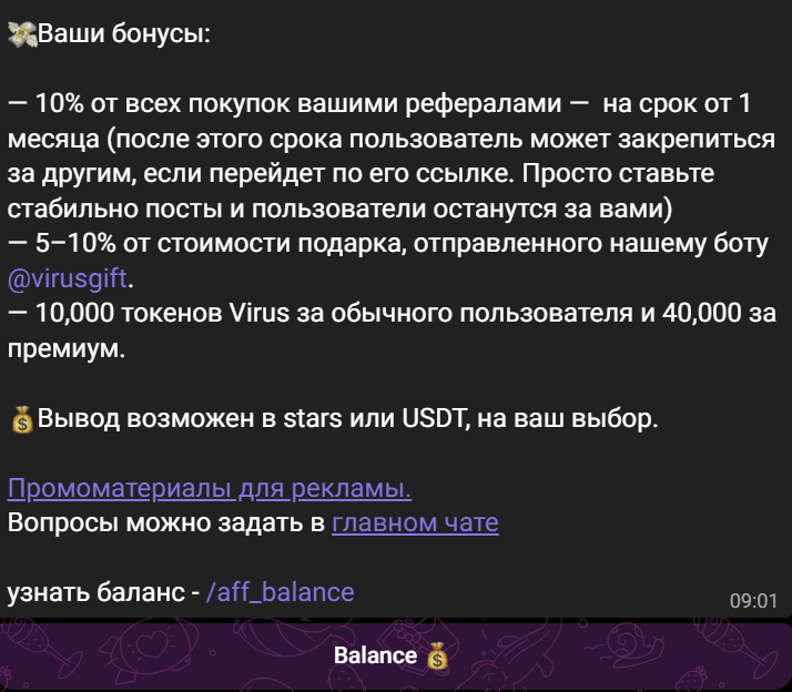 Реферальная программа в Телеграм Gift Relayer VIRUS сулит 10% от потраченных подписчиками звезд. За обычного пользователя будет начислено 10 000 токенов VIRUS, за подписчика с Телеграмм Premium — 40 000, в пересчете на доллары это совсем копейки. Для заработка хотя бы 1$ придется пригласить не менее 3 человек с Премиумом или 10 обычных.