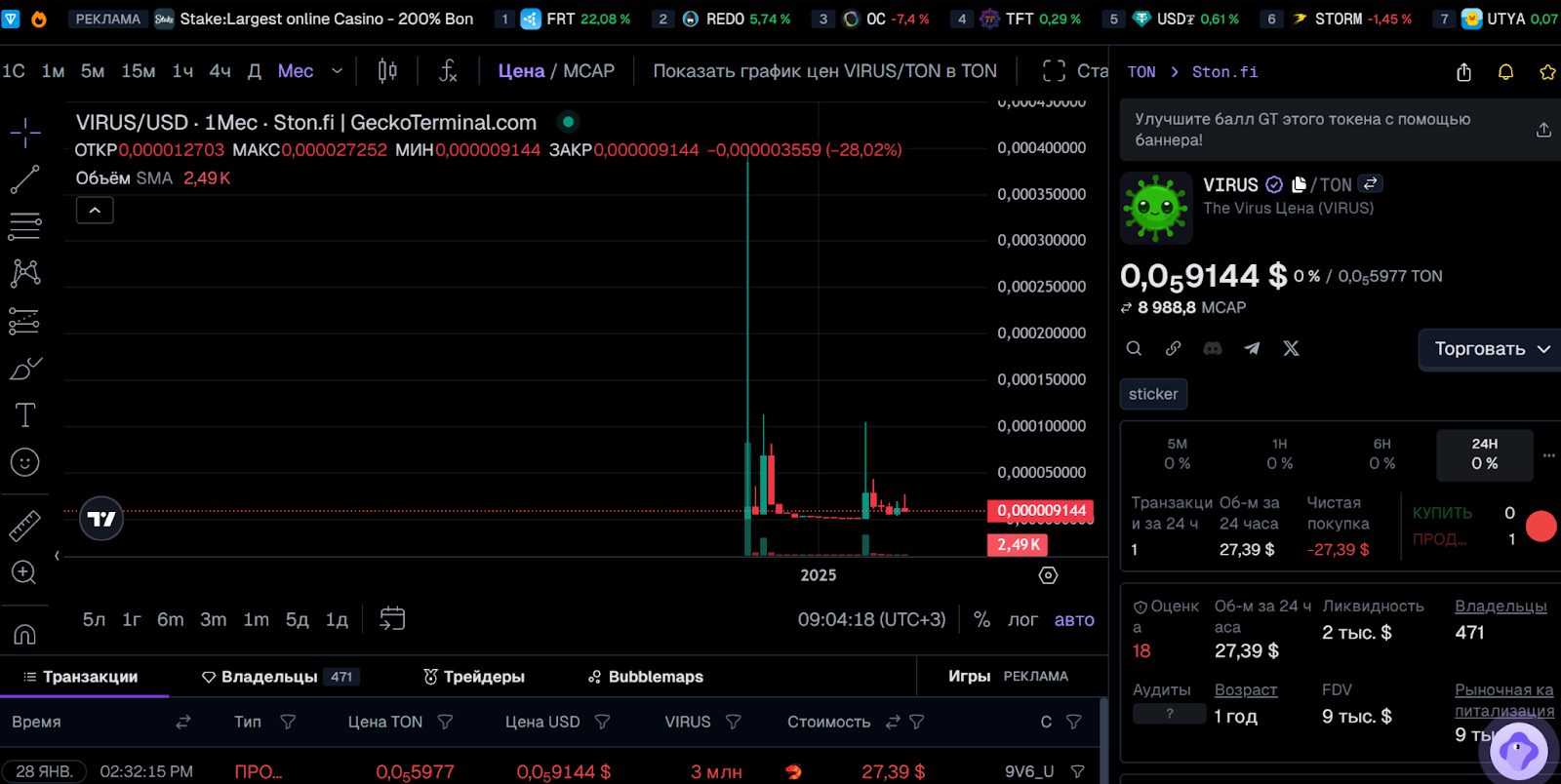 Прямой связи с создателями токена VIRUS нет, он вышел на биржи еще в 2024 году, а игра была запущена намного больше. Логотип монеты и бота совпадает. Токеномика: