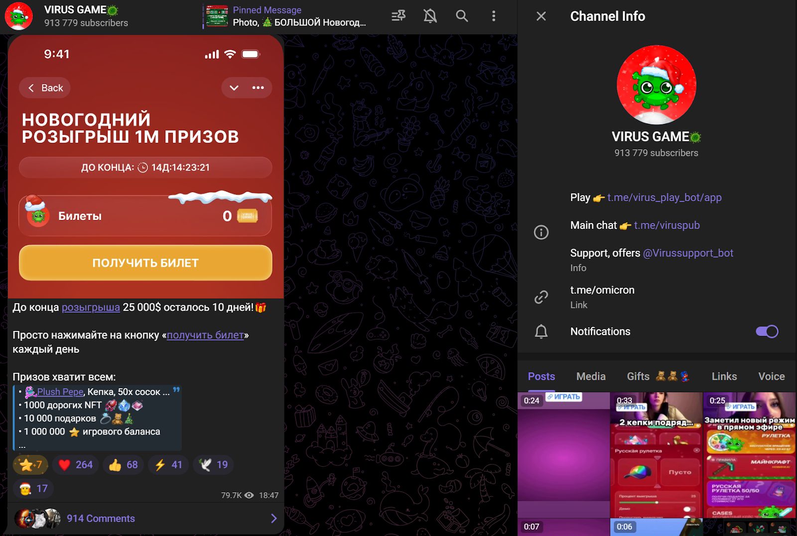 VIRUS GAME BOT запущен в феврале 2025 года, сейчас в боте около 650 тысяч игроков в месяц. Разработчики анонимны, в чате и канале есть только ссылки на саппорт, но никаких сведений о том, кто и для чего создал игру. Пользователям предложено множество возможностей получать подарки, например, крутить бесплатные спины, подписываться на каналы партнеров, тратить звезды для шанса купить NFT за половину цены, копить билеты для большой раздачи и многое другое. В боте есть Майнкрафт мини игра, доступны магазин и задания. Первоначально нужно излечиться от вируса, заплатив 250 звезд или пригласив 5 друзей, после этого станет доступна опция заработка токена VIRUS. Его можно будет обменивать на подарки и звезды. Для участия в разных раздачах и спинах нужно подписаться на Телеграмм VIRUSgift и вступить в чат.