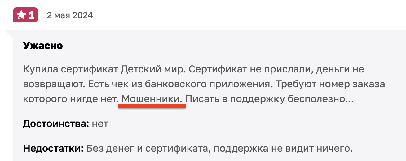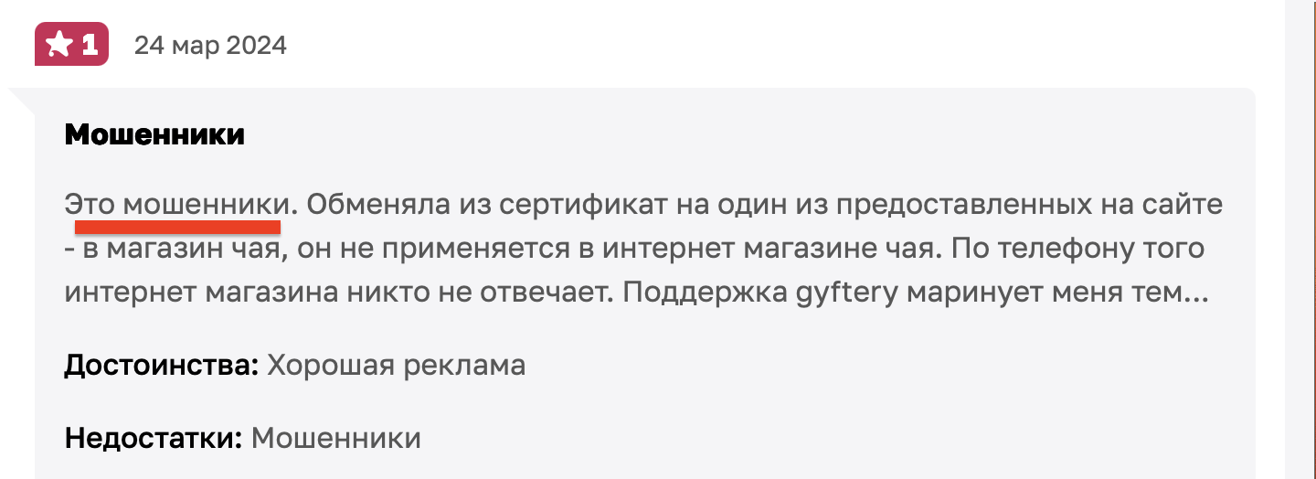 На независимых площадках отзывы о «Гифтери» в основном негативные, причем претензии повторяются из месяца в месяц. Люди жалуются, что после оплаты сертификат вообще не приходит на почту или не активируется в магазине, хотя бренд был в каталоге.