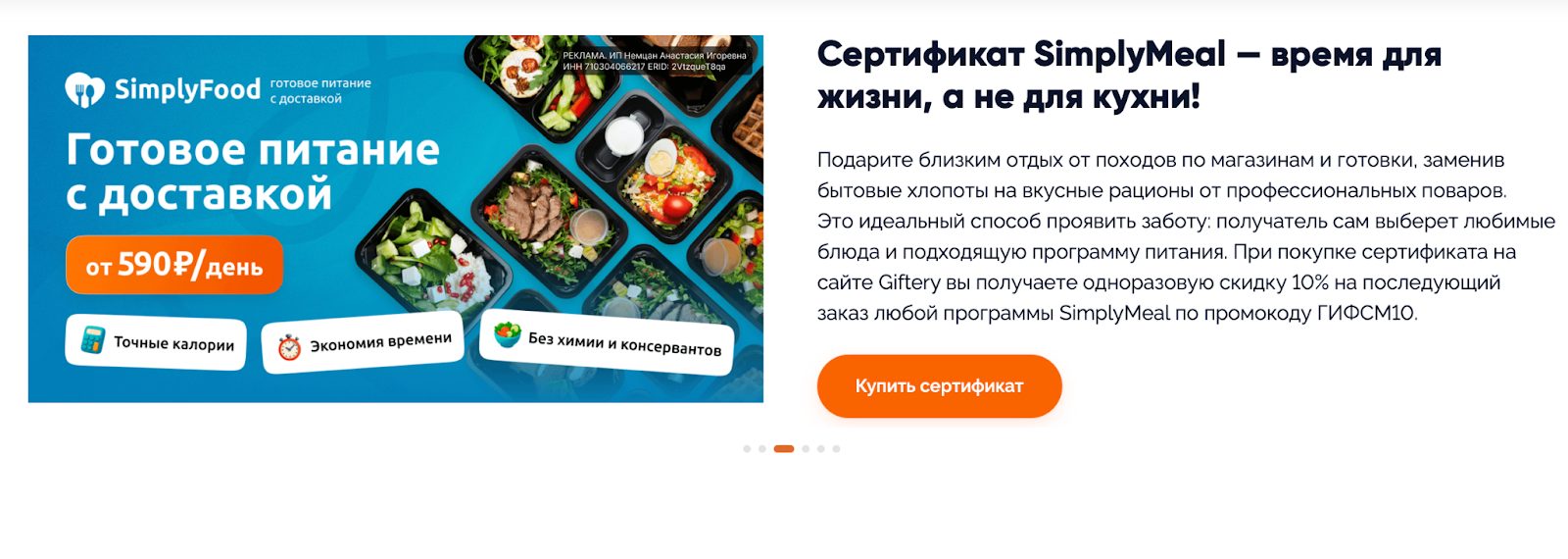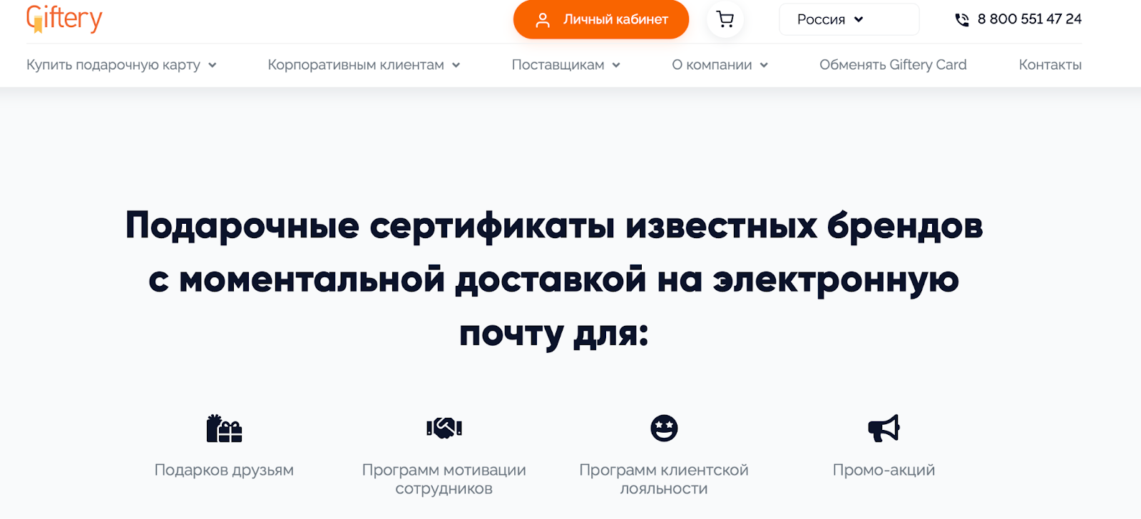 В целом сервис продвигает себя в статусе универсального решения для подарков по любому случаю. Помимо самих карт компания также внедряет различные промо-акции и систему лояльности Giftery Pro.