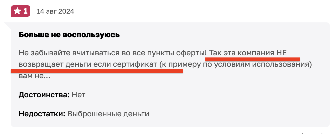 «Гифтери» обмен и возврат средства почти не делает или идет на это крайне неохотно. Компания ссылается на пункты оферты и говорит, что если сертификат не подошел по правилам партнера, то это уже не их проблема.