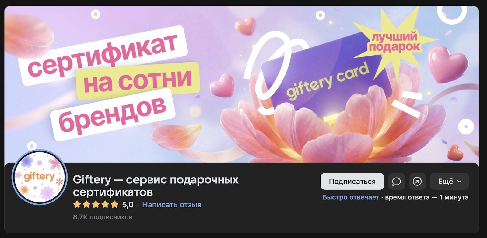 Профиль компании Giftery — обмен и продажа подарочных карт, которые покупатель может самостоятельно конвертировать в различные товары от широкого спектра магазинов. Подарки доступны самые разные: сервис сотрудничает с магазинами одежды и аксессуаров, косметики, украшений, детских товаров и т.д.
