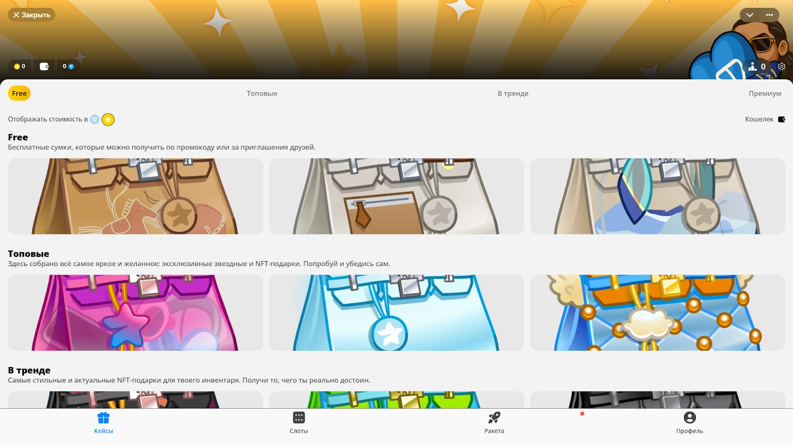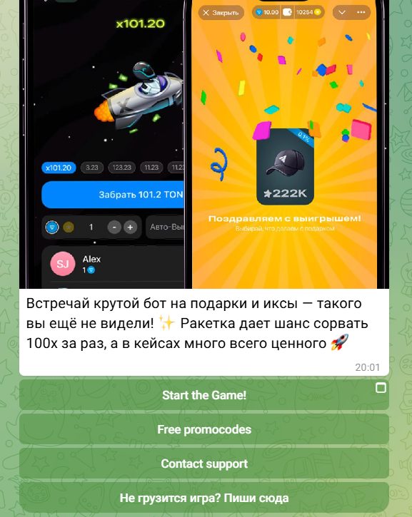 Презентация “крутого бота на подарки и иксы” обещает, что Ракетка поможет сорвать 100x за один раз, а в кейсах скрывается много уникальных гифтов. Подарки бота распределяются на обычные и редкие. Помимо получения призов в личную коллекцию, можно поделиться ими с друзьями. Форму регистрации для участия в боте заполнять не нужно, пользователи играют со своего Телеграмм-профиля.