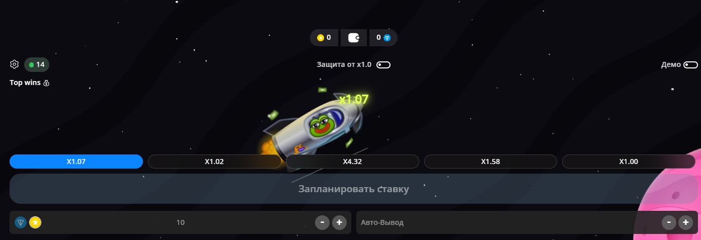 В разделе Ракета пользователи делают ставку, выбирая актив на нижней левой панели – Telegram звезды или Тон. Минималка начинается от 10 звезд или 0,1TON.