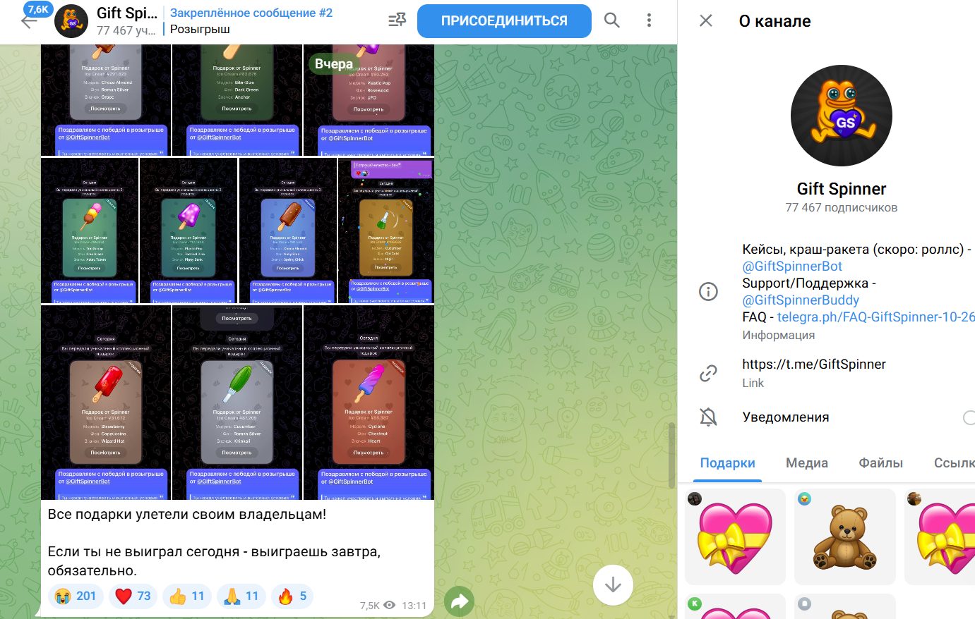 Обзор Телеграмм бота Giftspinnerbot: отзывы участников, какие подарки получают юзеры