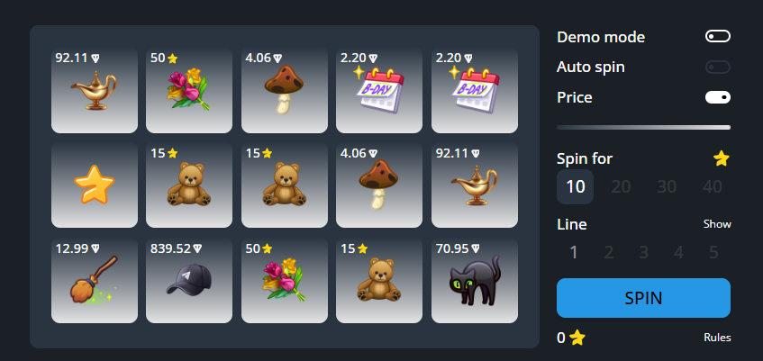 На момент нашего изучения ТГ проекта Гифт спиннер демо-режим прокрутки барабана не работает, зато активным оказался движок цены – можно посмотреть стоимость разыгрываемых подарков.