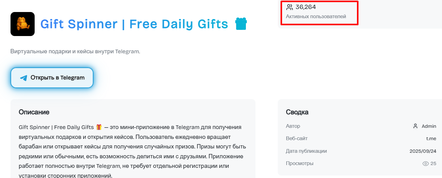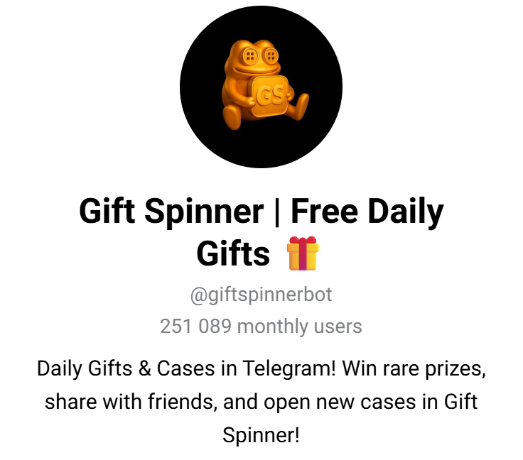 Giftspinnerbot – приложение на базе Telegram, в котором пользователь может получить NFT гифты, вращая барабан и открывая кейсы. На момент написания общая аудитория составляет свыше 250 тысяч участников. Далее в статье расскажем какие существуют риски при взаимодействии с ботом и не окажутся ли заявленные подарки ничего не стоящими фантиками.
