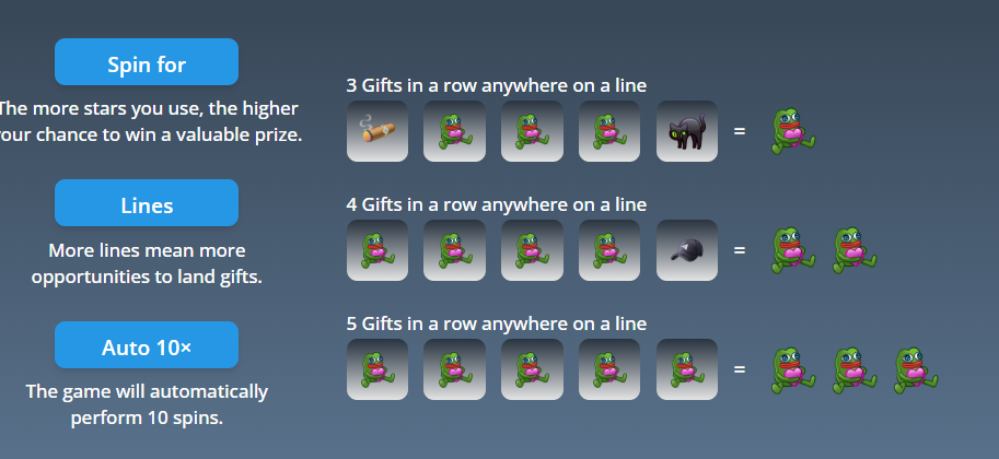 Чем больше звезд использует пользователь, тем больше шансов выиграть ценные призы. Таким образом инвестиционный проект пытается выманить у участников как можно больше вкладов за призрачную возможность получить три, четыре или пять одинаковых подарков в одном ряду.