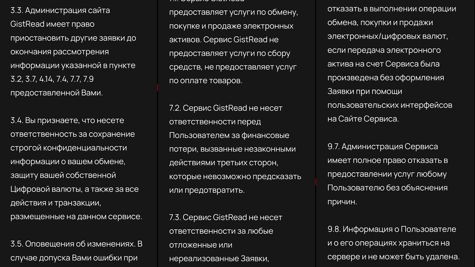 Gist Read работает без лицензии и может в любой момент отказать в предоставлении услуг без причин. Исходя из правил, сервис не берет ответственность за какие-либо убытки клиентов и имеет право не возвращать средства. Из других фактов о проекте: