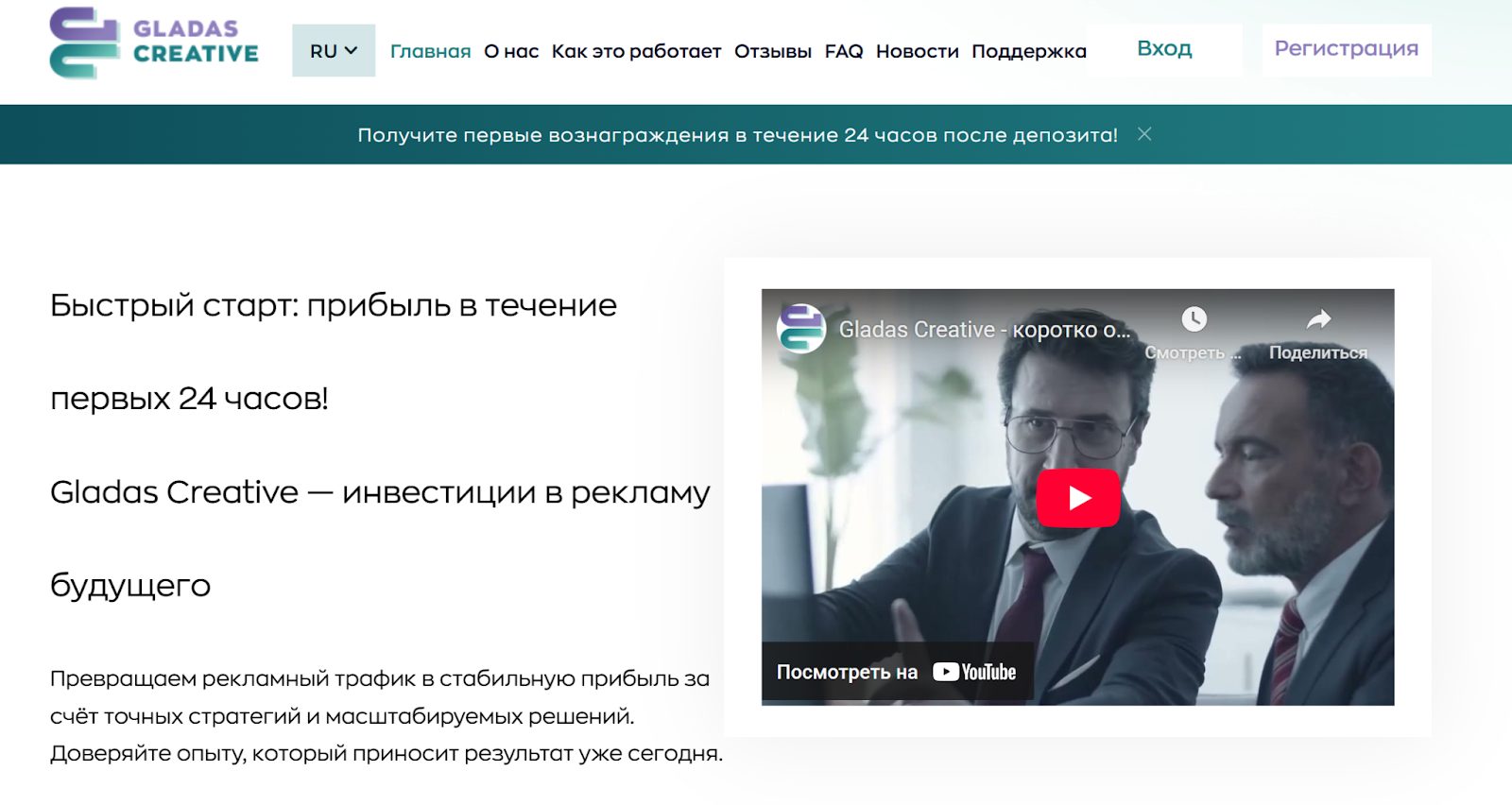 В описании о себе представители Gladas Creative заявляют о ведении инвестиционной деятельности. Они говорят о работе в сфере высокодоходных инструментов. В список основных задач входит создание рекламных кампаний для крупных платформ и брендов. Также эксперты берут на себя цикл затрат. Все начинается с приобретения трафика и заканчивается вопросами оптимизации.