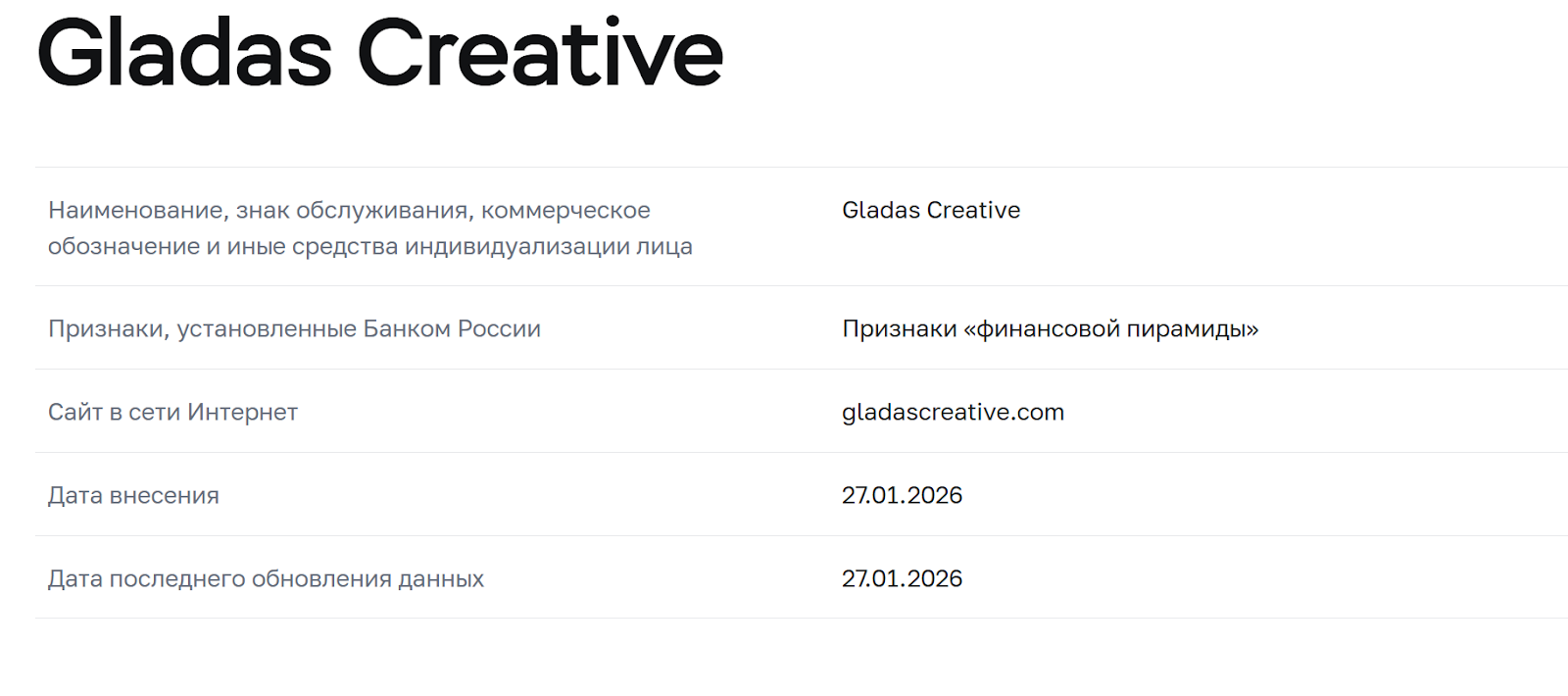 После перехода можно увидеть, что Gladas Creative Ltd действительно ведет регулируемую деятельность. Здесь говориться об активном статусе компании и регистрации еще 16 мая 2021-го. Все выглядит правдиво, но это не так. В реальности сайт, на который отправляют гостей, является подделкой. По факту он создан мошенникам и наполняется ими. Кроме того, проверка домена показала его наличие в черном списке ЦБ РФ.