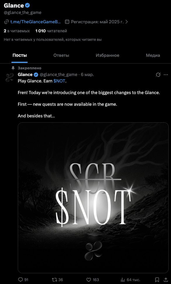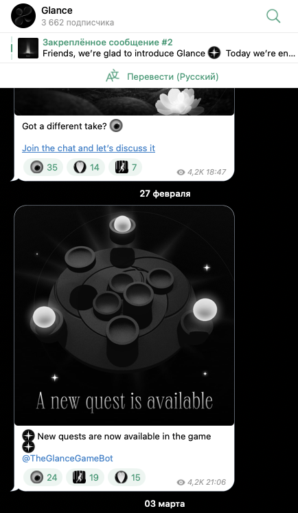 На телеграмм-канал Glance, располагающийся по адресу glance the game, на 19 марта 2026-го года, подписаны 3,66 тысяч пользователей. Публикации на ТГК собирают в среднем по 3,5-4,5 тысяч показов и 30-50 реакций.