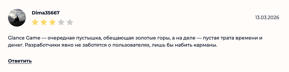 В интернете отзывов о telegram-игре Glance почти нет. Автор единственного ревью выражает сомнения относительно того, что на данное мини-приложение есть смысл тратить время.