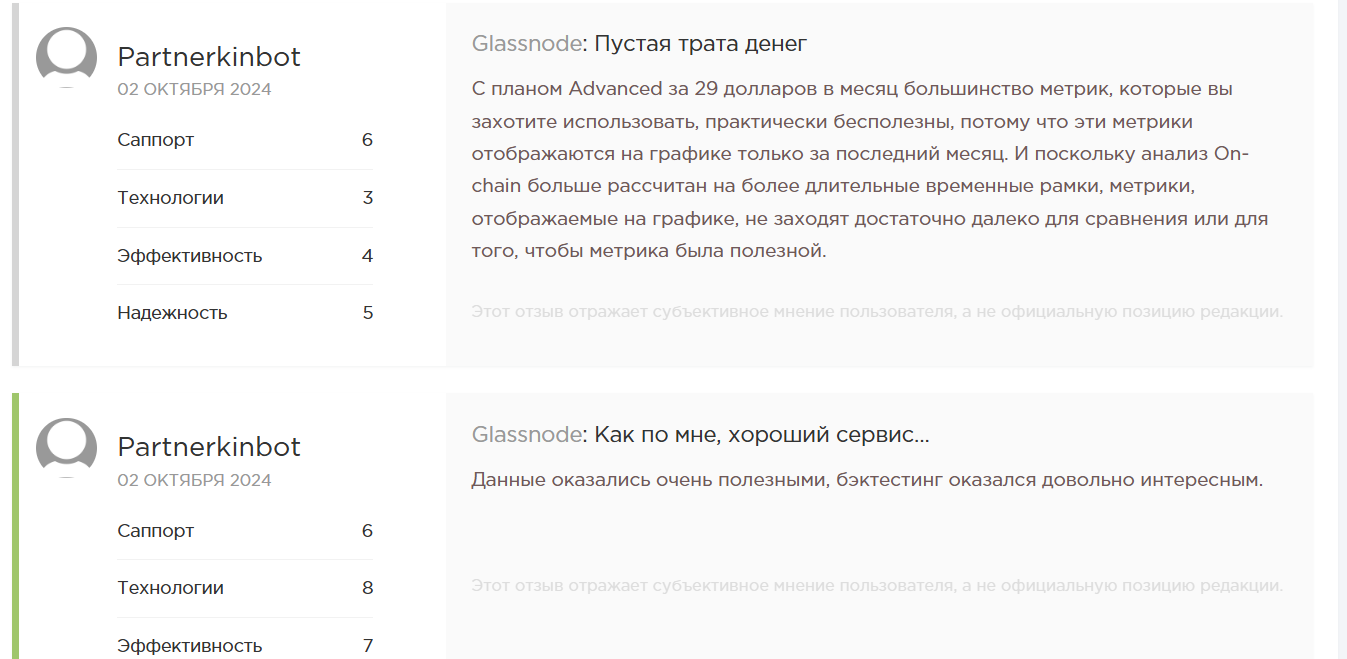 В сети встречаются преимущественно как отрицательные, так и положительные отзывы о Glassnode, но их мало. Люди критикуют высокую стоимость программы, отмечают низкую эффективность на самом дешевом тарифе. При этом есть положительные замечания, в которых люди отмечают получение положительной информации о данном сервисе. Предоставляемые данные помогают им в торговле.