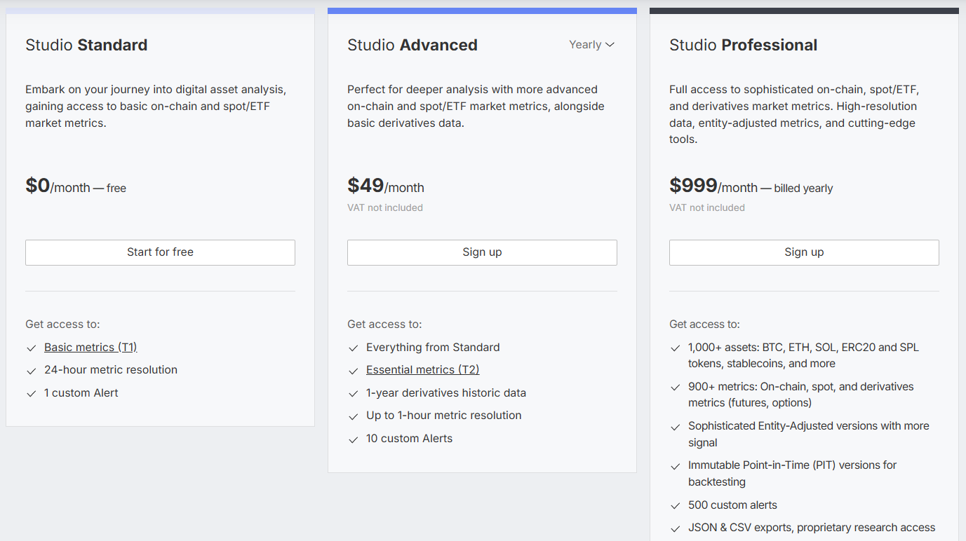Glassnode com предлагает несколько моделей оплаты. Тут есть как платная, так и бесплатная форма использования. Пользователям доступно несколько тарифов: