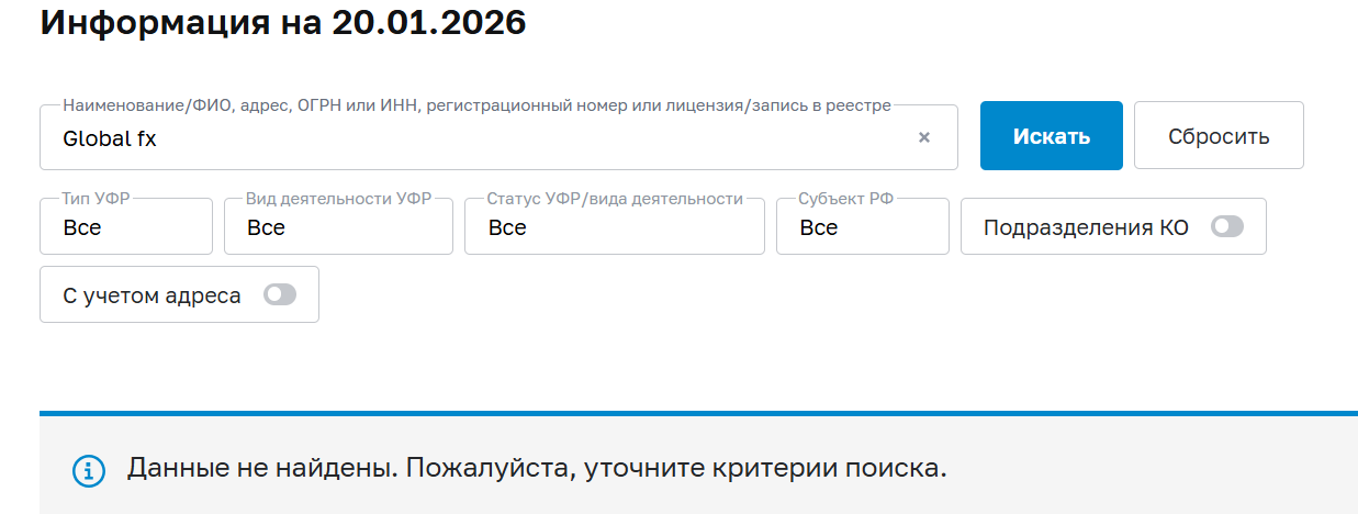 У Global fx судя по отзывам были офисы в России, Сингапуре и США, а также штаб-квартира в Канаде. Есть сомнения, что они все существовали, потому что в некоторых из этих стран терминал легально не работал. На 21 января 2026 года ничего этого нет, как и самой компании. Это странно, ведь он действовала на рынке с 2009 по 2020 год. У нее была регистрация в Гонконге, но при этом деятельность не регулировалась ни одним финансовым международным органом, доказательств этому не найти.
