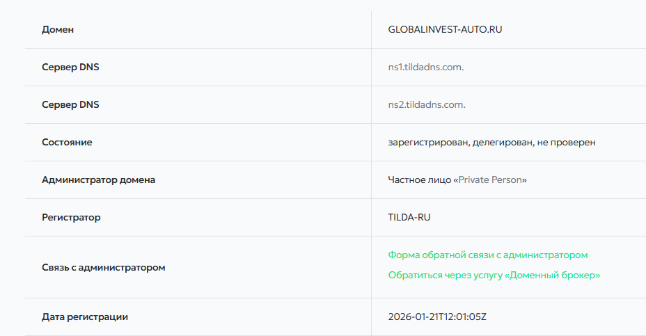 Домен сайта globalinvest-auto ru запущен 26 января 2026 года.
