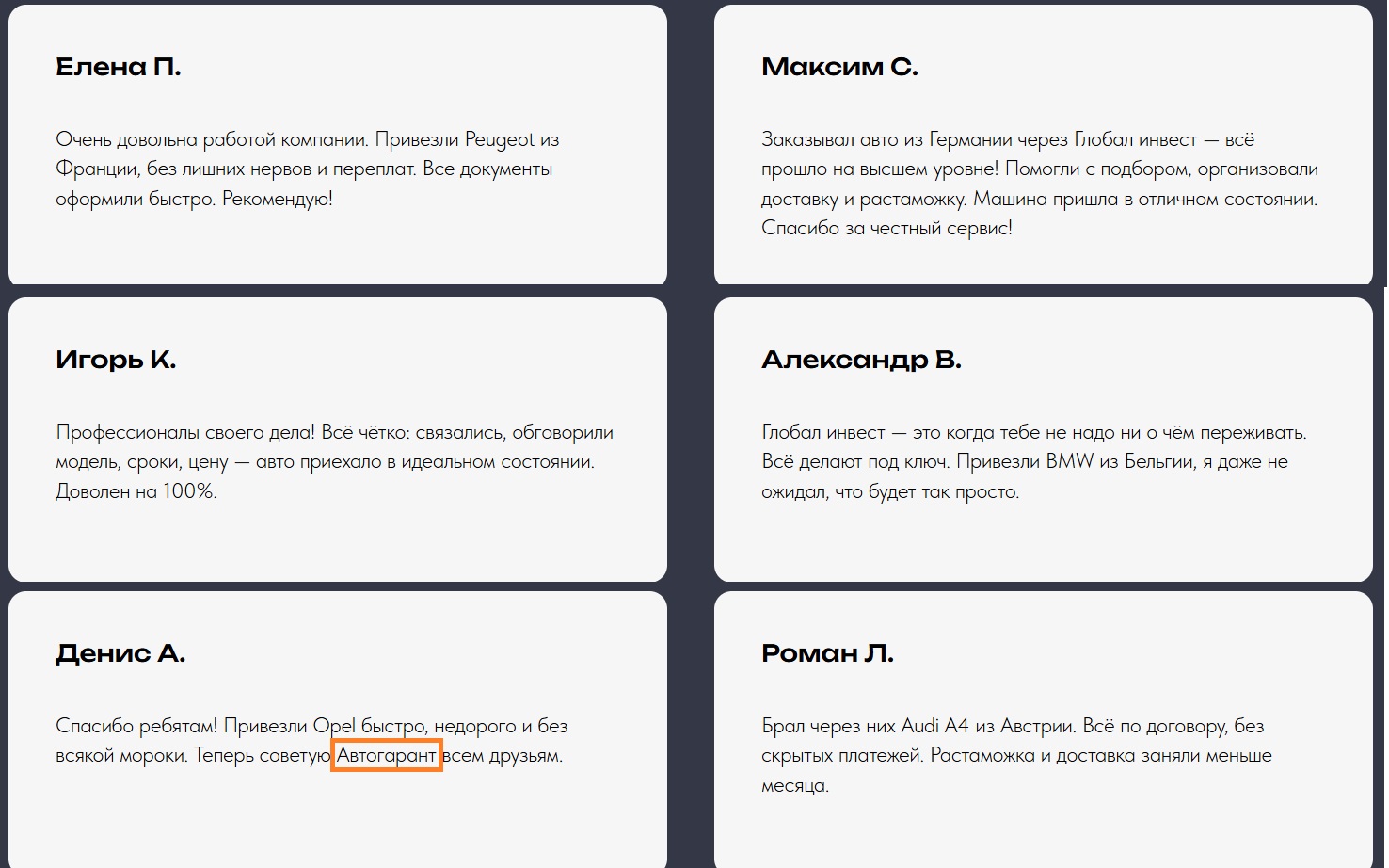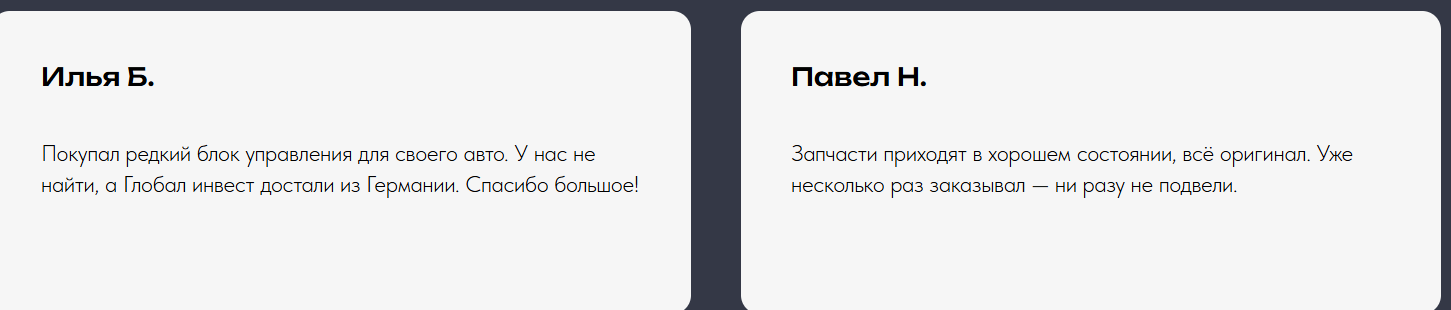 На сайте сервиса по пригону авто из Европы Глобал Инвест размещены исключительно положительные отзывы в видео- и текстовом формате. Формулировки шаблонные: все прошло идеально, без нервов, профессионалы своего дела. Конкретики по этапам оплаты, сопровождении менеджеров, стоимости таможенного оформления VIN-номеров или реально подтвержденных сделок, в них нет.