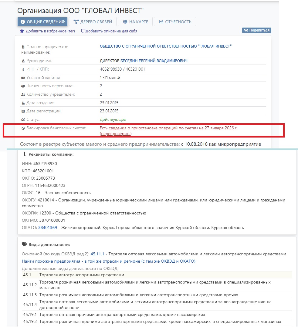 На площадке есть раздел “О нас”, но информация о компании в нем отсутствует. Там только реклама и внушительная статистика — более 10 лет работы, 3500 пригнанных авто, доставка до двух недель и т.д. Хотя в футере, владельцы выдали блок, где указано, что проект якобы принадлежит ООО «ГЛОБАЛ ИНВЕСТ». Мы проверили эти данные. Компания на самом деле прошла регистрацию в Курске 23 января 2015 года. Задекларированный вид деятельности — торговля легковыми автомобилями. Но по отчетам за 2025 год фирма показала убытки, более того, 27 января 2026 ее банковские счета были заблокированы.