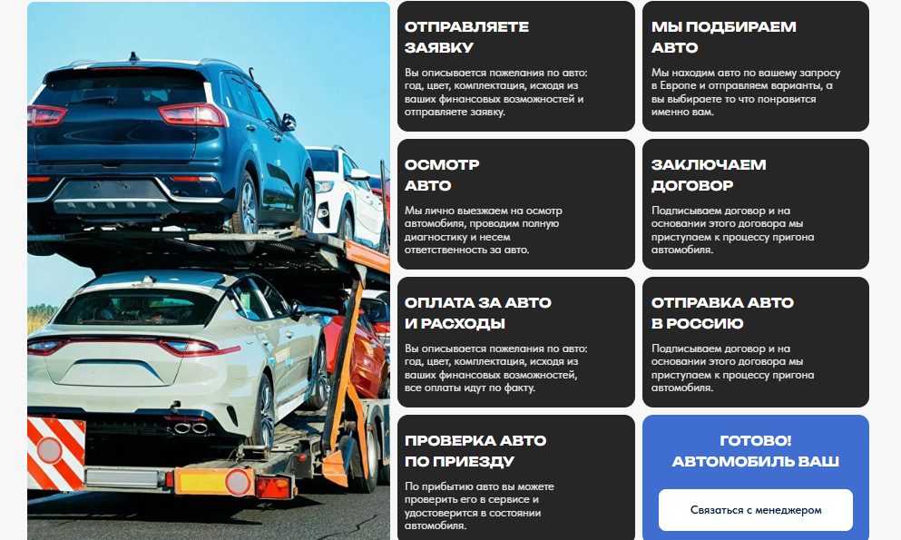 Схема работы описана стандартно: клиент оставляет заявку, согласовывает параметры, вносится аванс, составляется договор (образец не предоставлен). Дальше компания под конкретный запрос подбирает авто, выкупает его и доставляет в РФ. Указано, что все оплаты идут по факту, однако конкретный порядок расчетов и реквизиты для перевода в открытом доступе не размещены.