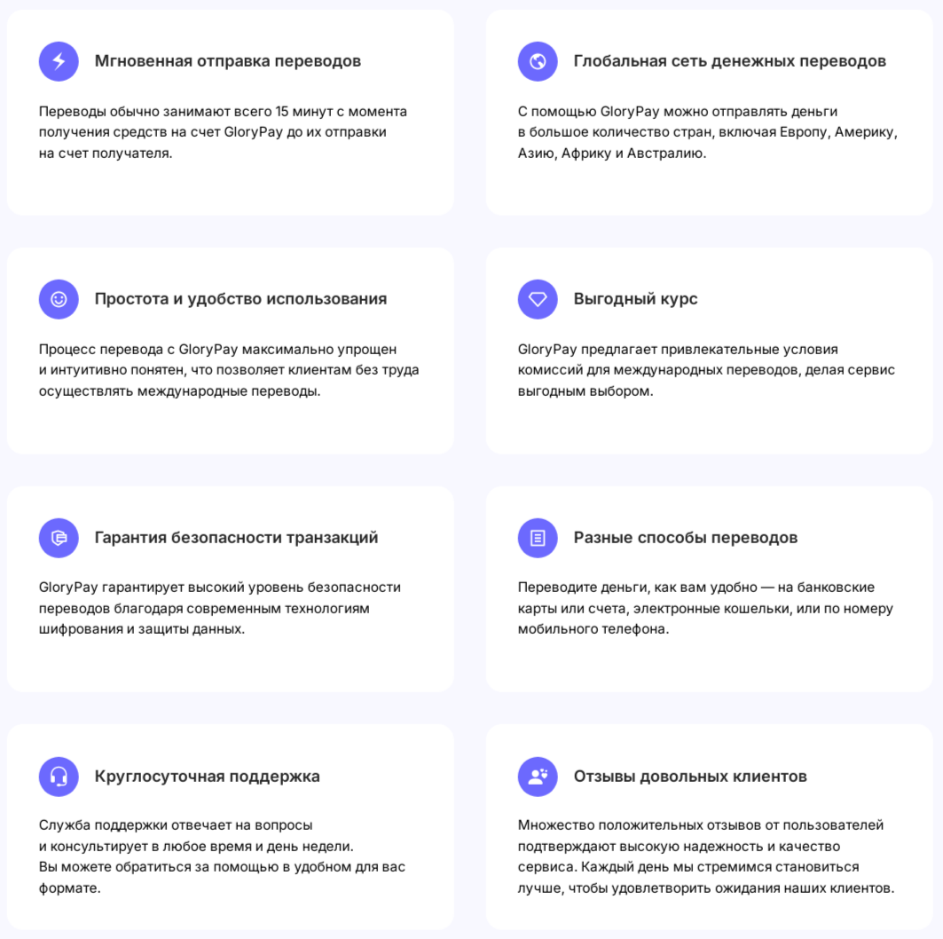 На сайте GloryPay много внимания уделяют возможностям и преимуществам проекта. В одном из списков находятся такие пункты: