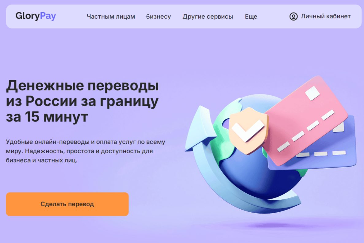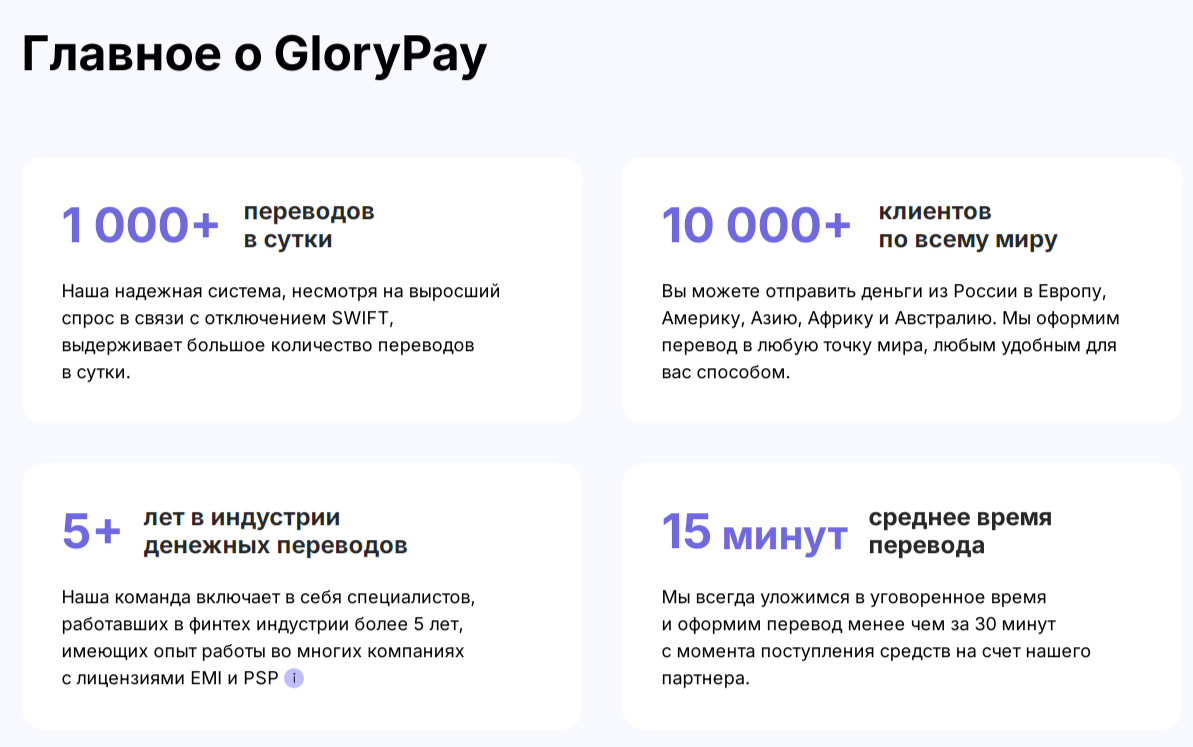 На главной странице компании GloryPay рассказывается, что сервис помогает юридическим и физическим лицам из России быстро и удобно совершать онлайн-переводы по всему миру. Сам сайт выглядит просто. Здесь нет документации и юридических данных конторы.