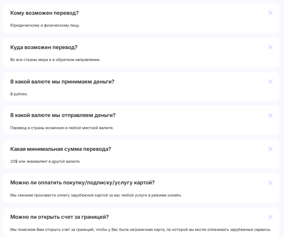 Переводить средства можно юридическим и физическим лицам во все страны мира. На сервисе принимаются только российские рубли, а отправка происходит уже в местной валюте, в зависимости от конечной точки. Минимальная сумма перевода 20$ или эквивалент в другой валюте.
