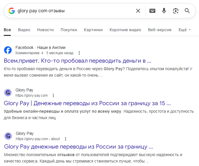 В интернете о проекте нет ни слова, что показывает его невостребованность и ставит под сомнение 3-х летний стаж работы. Отзывов от аудитории «Глори Пэй» Glory Pay Com тоже не видно, хотя авторы указывали, что их база клиентов превышает 10 000 человек.